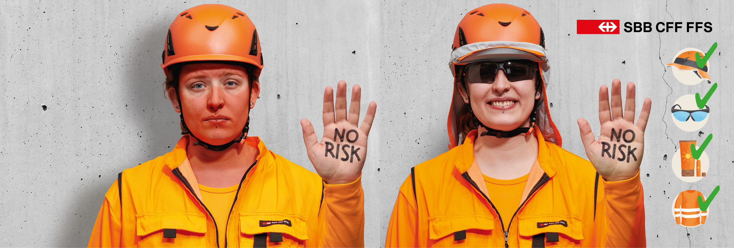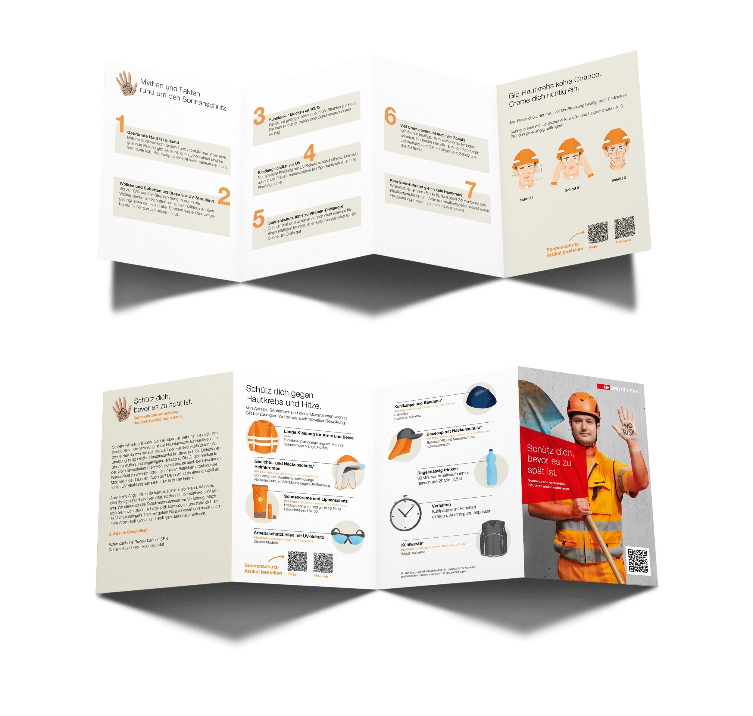 Das Problem direkt und schonungslos aufzeigen. Ohne Schutz, mit Schutz, ohne Sonnenbrand, mit Sonnenbrand. Eine einfache Didaktik, die alle verstehen. Diverse Massnahmen wie Plakate, Flyer, Dispenser, Stickers im Arbeitsbereich der Mitarbeitenden, die Outdoor tätig sind.